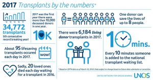 A total of 34,768 organ transplants were performed in 2017 using organs from both deceased and living donors, according to preliminary data. This total is a 3.4 percent increase over 2016 and marks the fifth consecutive record-setting year for transplants in the United States. Record number of donor organs were recovered and transplants occurred for each of the four most common organs transplanted – kidney, liver, heart and lung.